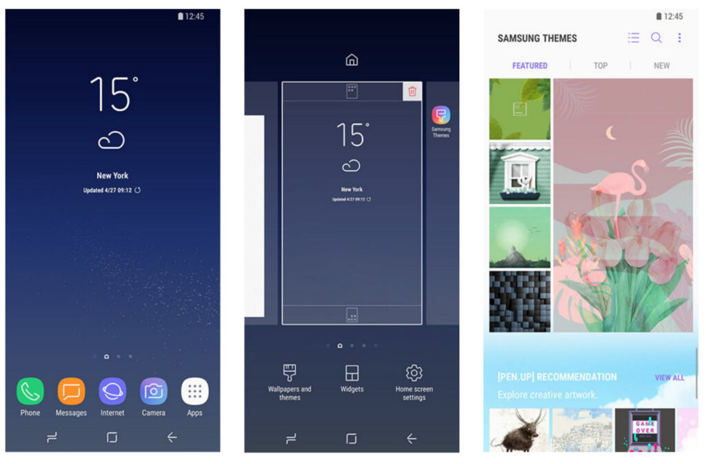 • Themes can be found on the Samsung Theme Store and third-party app stores; exercise caution when downloading from unknown sources.