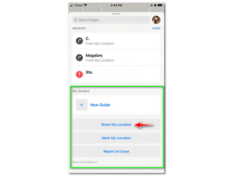 3. Share: Tap the location or pin, then tap the “Share” button.