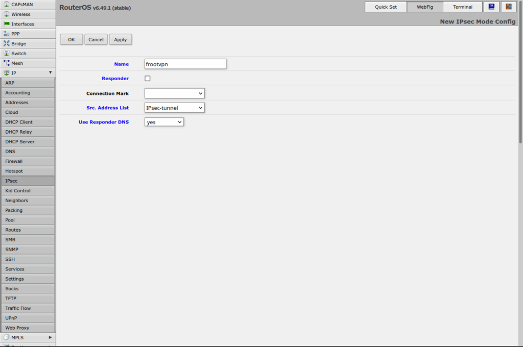 • IPsec Identifier: The identifier used for authentication (often the same as the local ID on the Mikrotik router).