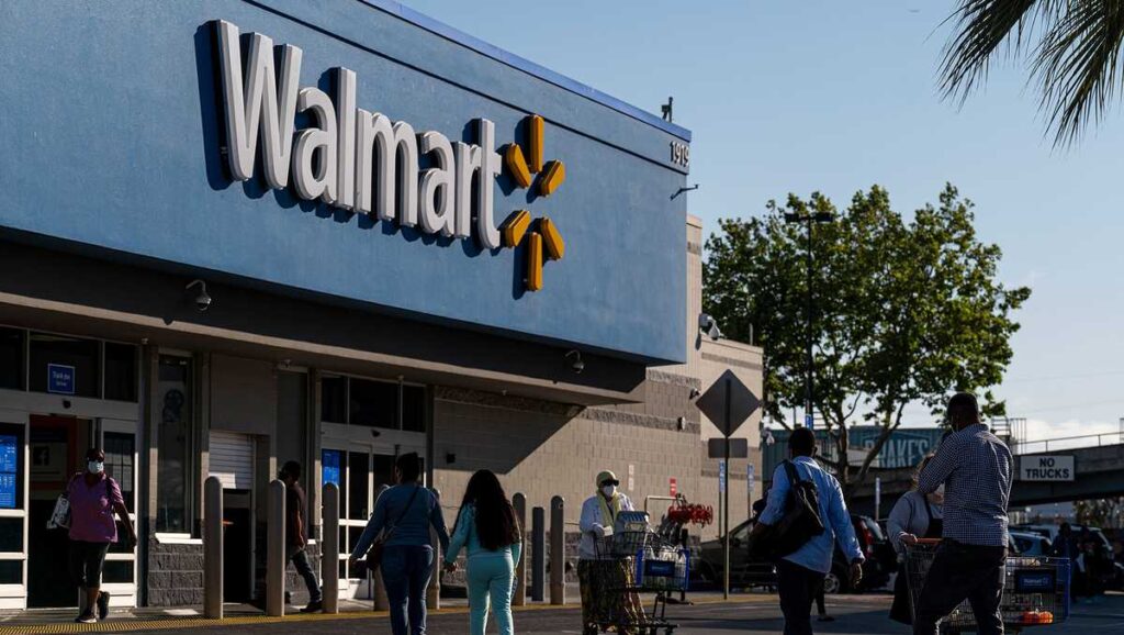 [Image: Walmart store exterior with recycling bins and hazardous waste disposal signage]