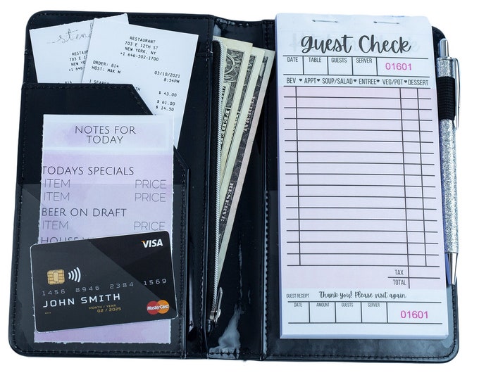 • Multiple Pockets: Ensure the book has enough pockets to hold order pads, pens, guest checks, credit card slips, and cash.