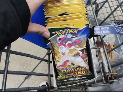 [Image: A person looking at a shelf of Pokemon cards in Walmart]