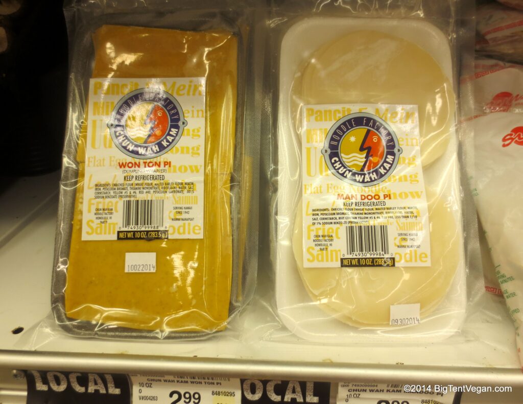 [Image: Close up of wonton wrappers packaging in a refrigerated display]